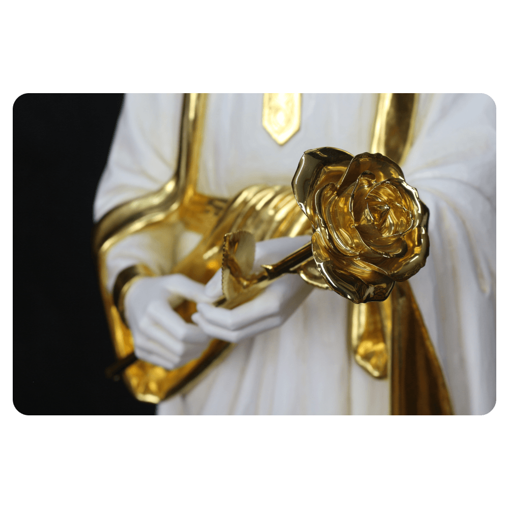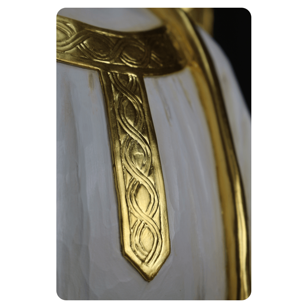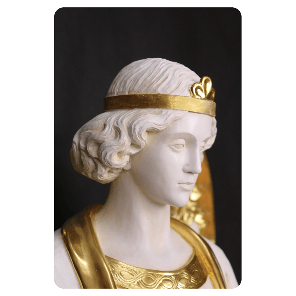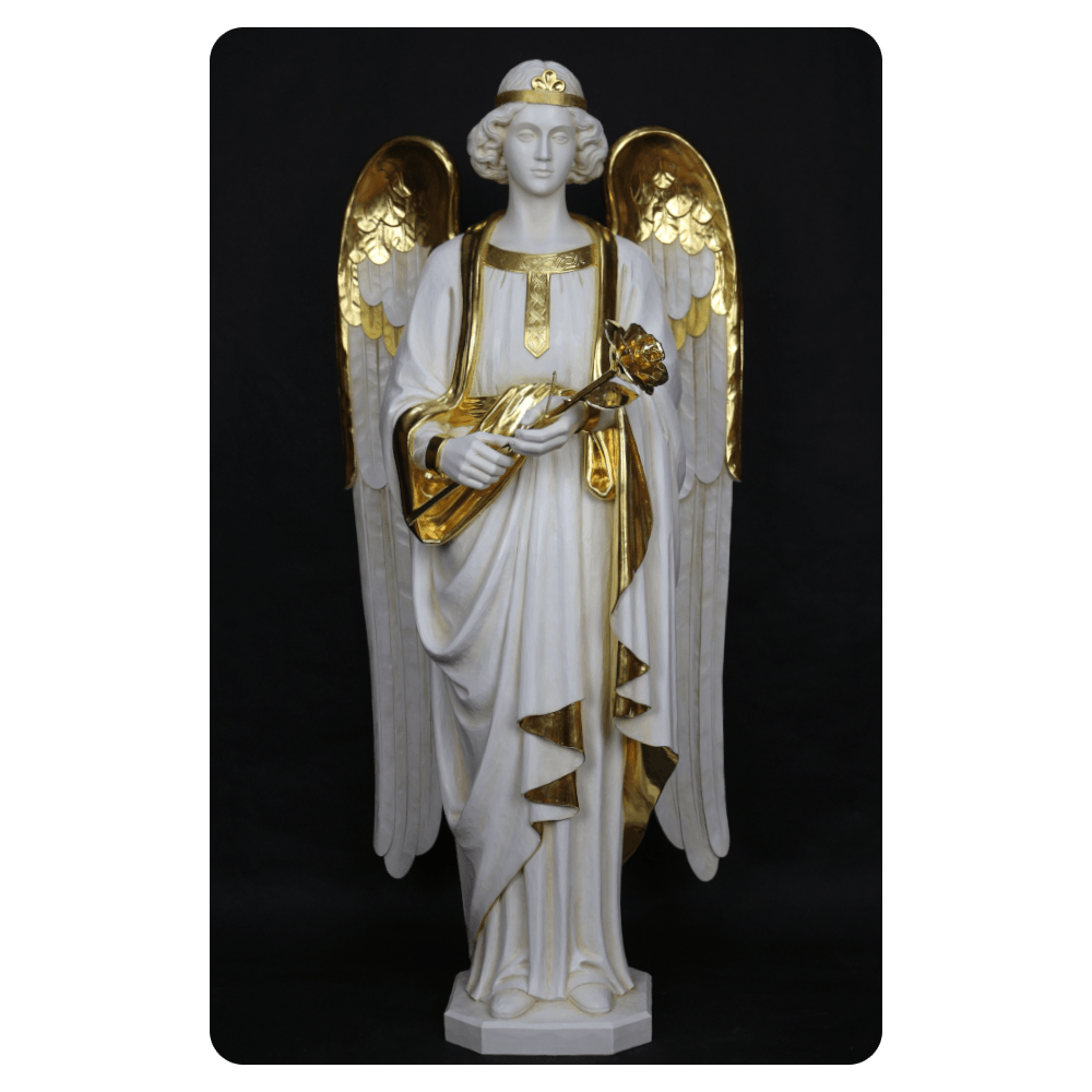 Oferujemy różne formy wykończenia rzeźb: naturalne drewno, wybarwienie bejcą oraz polichromię. Wykonujemy także złocenia złotem płatkowym, które podkreślają detale skrzydeł, szat i nadają rzeźbom szlachetny, sakralny charakter.