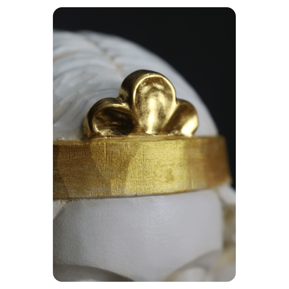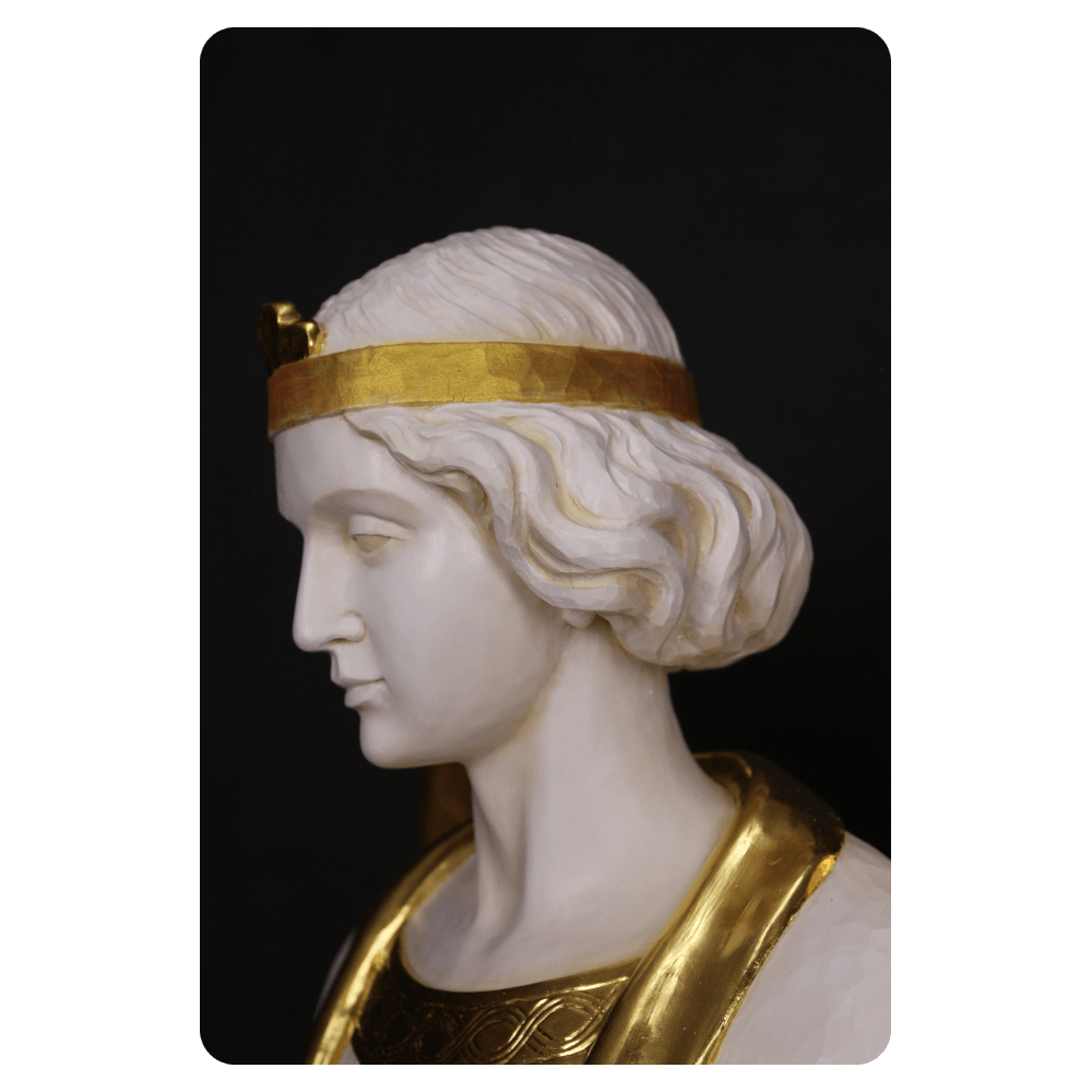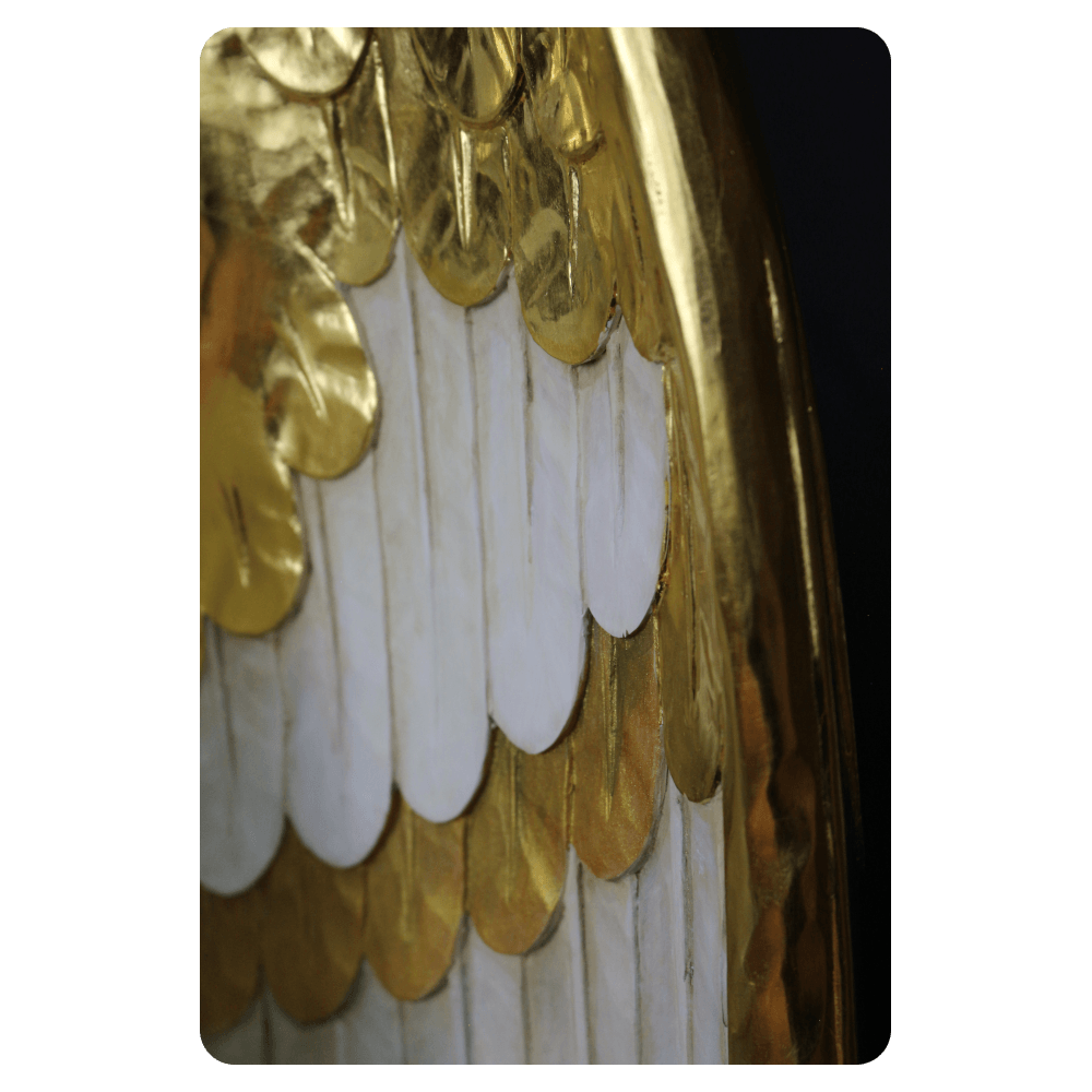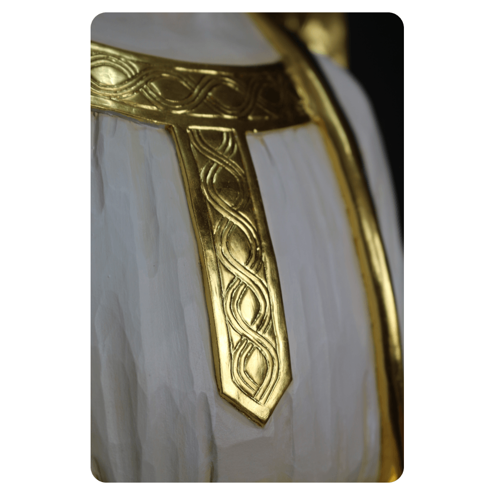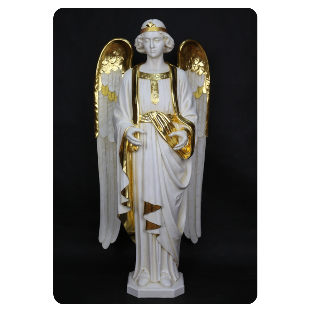 Oferujemy różne formy wykończenia rzeźb: naturalne drewno, wybarwienie bejcą oraz polichromię. Wykonujemy także złocenia złotem płatkowym, które podkreślają detale skrzydeł, szat i nadają rzeźbom szlachetny, sakralny charakter.