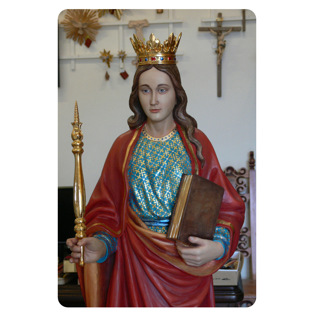 Rzeźba przedstawiająca świętą Jadwigę to ręcznie wykonana figura sakralna ukazująca jedną z najważniejszych patronów religijnych i społecznych w historii chrześcijaństwa. Święta Jadwiga Śląska (około 1178–1243) zasłynęła z życia pełnego modlitwy, pokuty oraz działalności charytatywnej i fundacyjnej. W ikonografii przedstawiana jest zazwyczaj w długiej sukni lub habicie, często z atrybutami takimi jak model kościoła, księga, krzyż czy buty — symbolizujące jej pokorę, dobroczynność i troskę o rozwój życia duchowego wiernych. Jej postać stanowi inspirację do duchowego rozwoju oraz oddania w modlitwie i miłosierdziu.