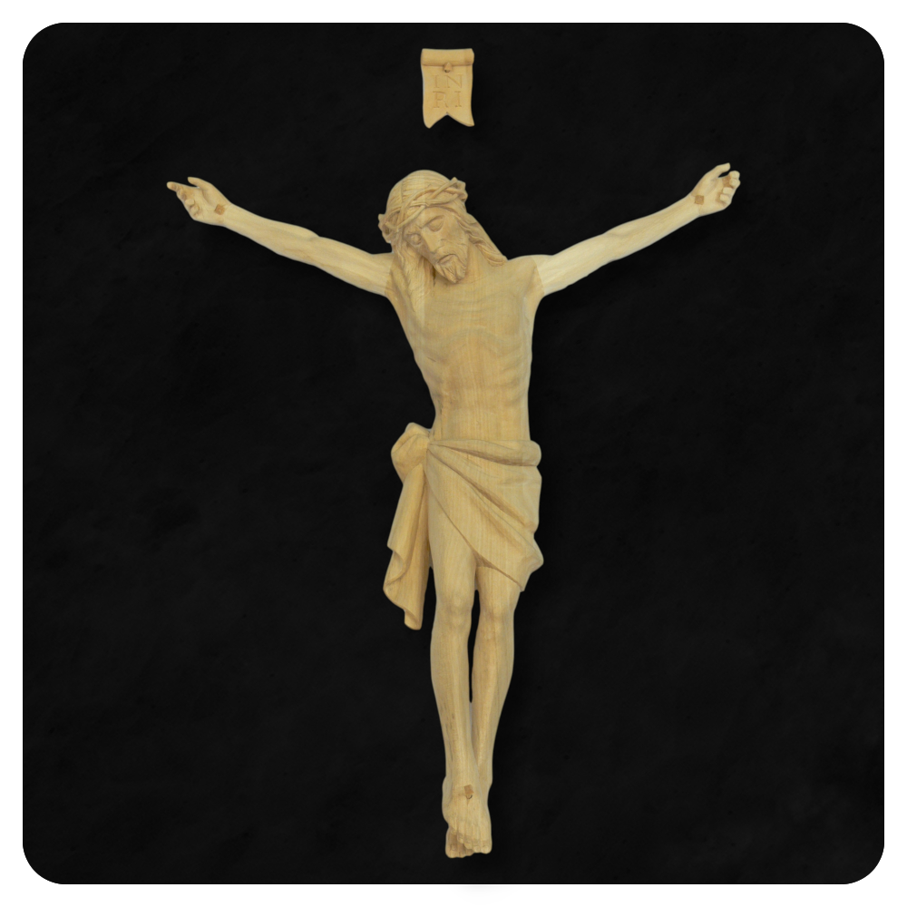 Każdy krucyfiks, który powstaje w naszej pracowni to ręcznie wykonana, unikatowa rzeźba. Figura Chrystusa tworzona jest z drewna lipowego bądź dębowego, z dbałością o proporcje i detale. Krzyże wykonujemy z różnych gatunków drewna, dobierając materiał i rozmiar tak, aby całość tworzyła spójną i harmonijną kompozycję.