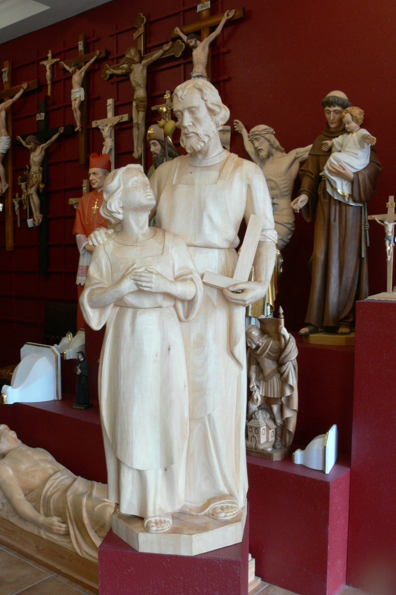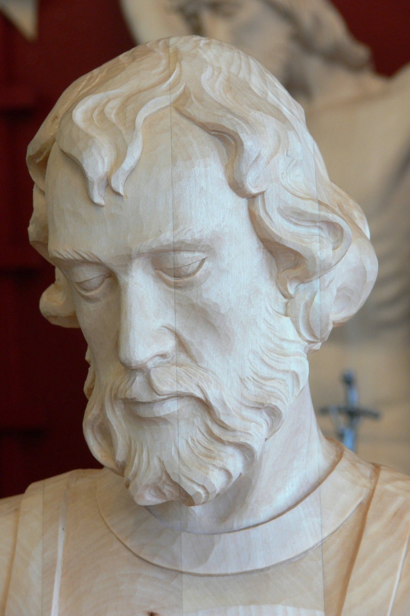 Prezentujemy Państwu nasz ostatni projekt - rzeźbę przedstawiającą postać Józefa z Jezusem. Model wykonała Edyta na podstawie dostępnej ikonografii, natomiast figurę o wysokości 100 cm w drewnie lipowym wyrzeźbił Grzegorz. Całość została pokryta bezbarwnym woskiem w celu zabezpieczenia przed zabrudzeniem. Rzeźba trafi do St. Josephs Catholic School w Londynie